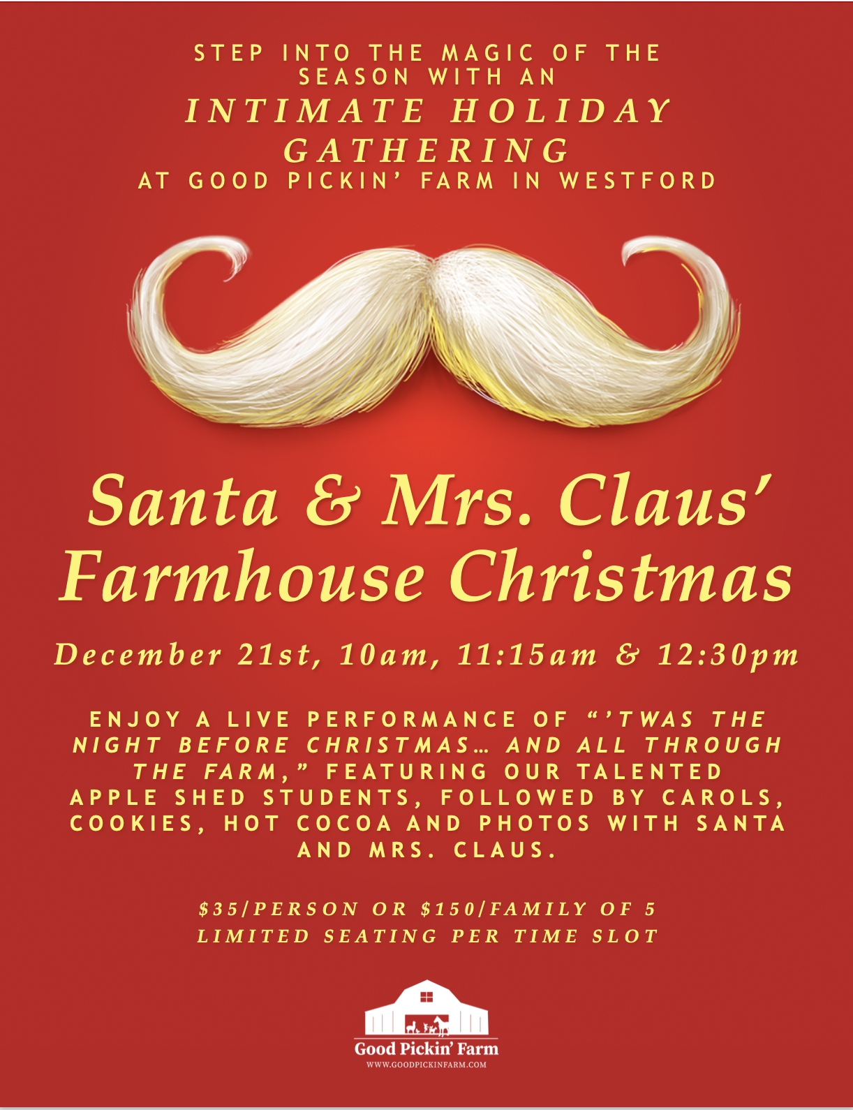 Back to All Events Santa & Mrs. Claus' Farmhouse Christmas Sunday, December 21, 2025 10:00 AM 1:30 PM Google Calendar ICS Purchase Tickets